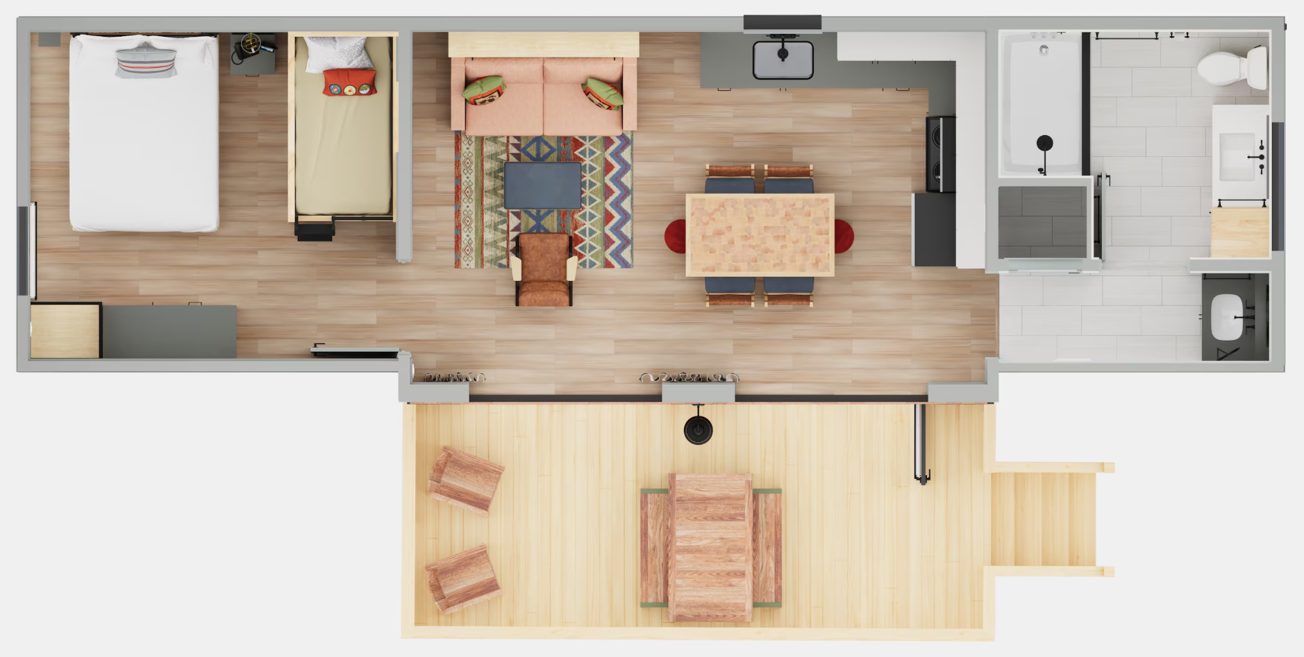 - Cabin: 527 sq.ft. + outdoor deck (Sleeps 6)