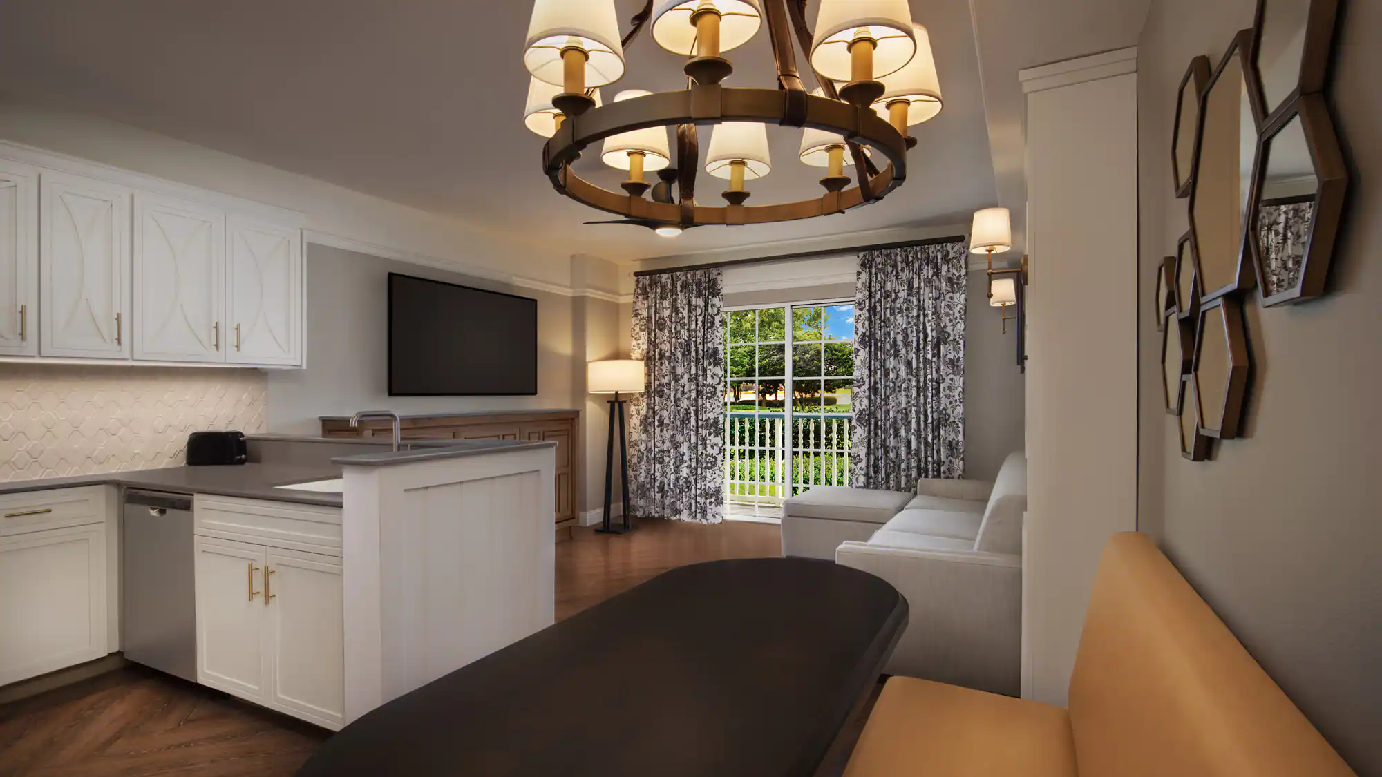 Deluxe Studio Villas feature one full bathroom and accommodate up to four Guests, plus one child under age three in a crib, and include a kitchenette, queen-size bed, double-size sleeper sofa, flat-panel TV, DVD player, and private balcony.